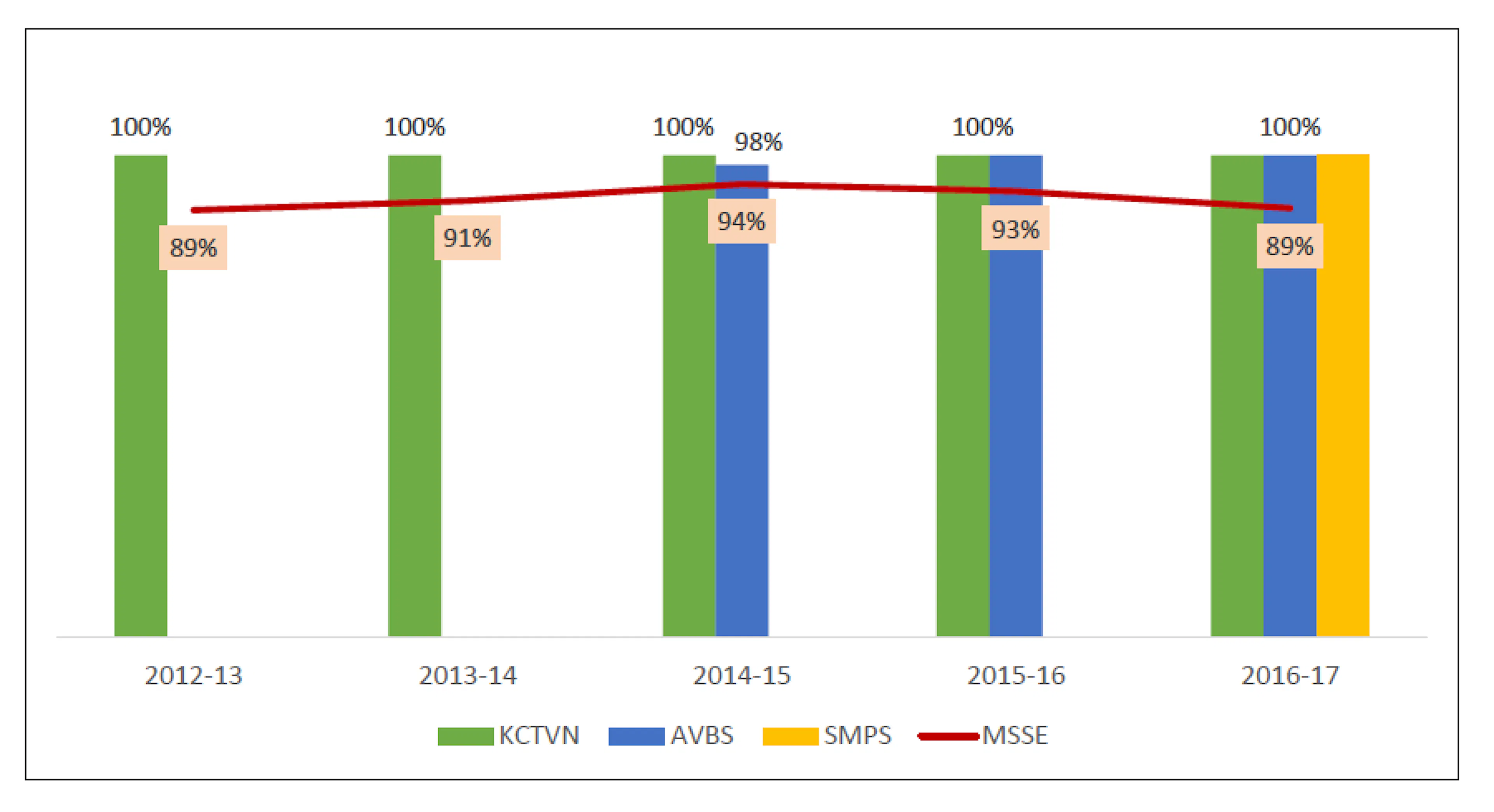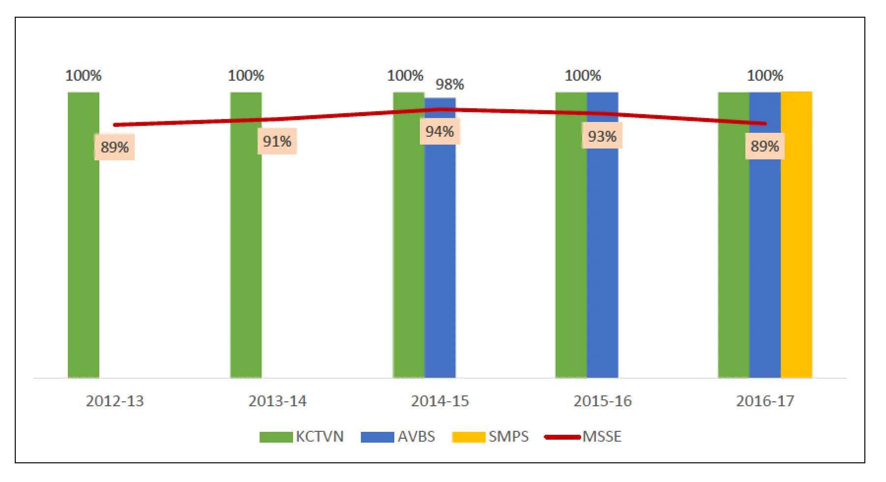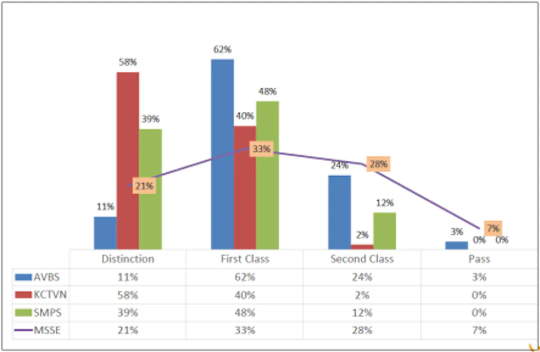 KCTVN (the red bar) our first and oldest school has had a consistent 100% pass rate for five years now